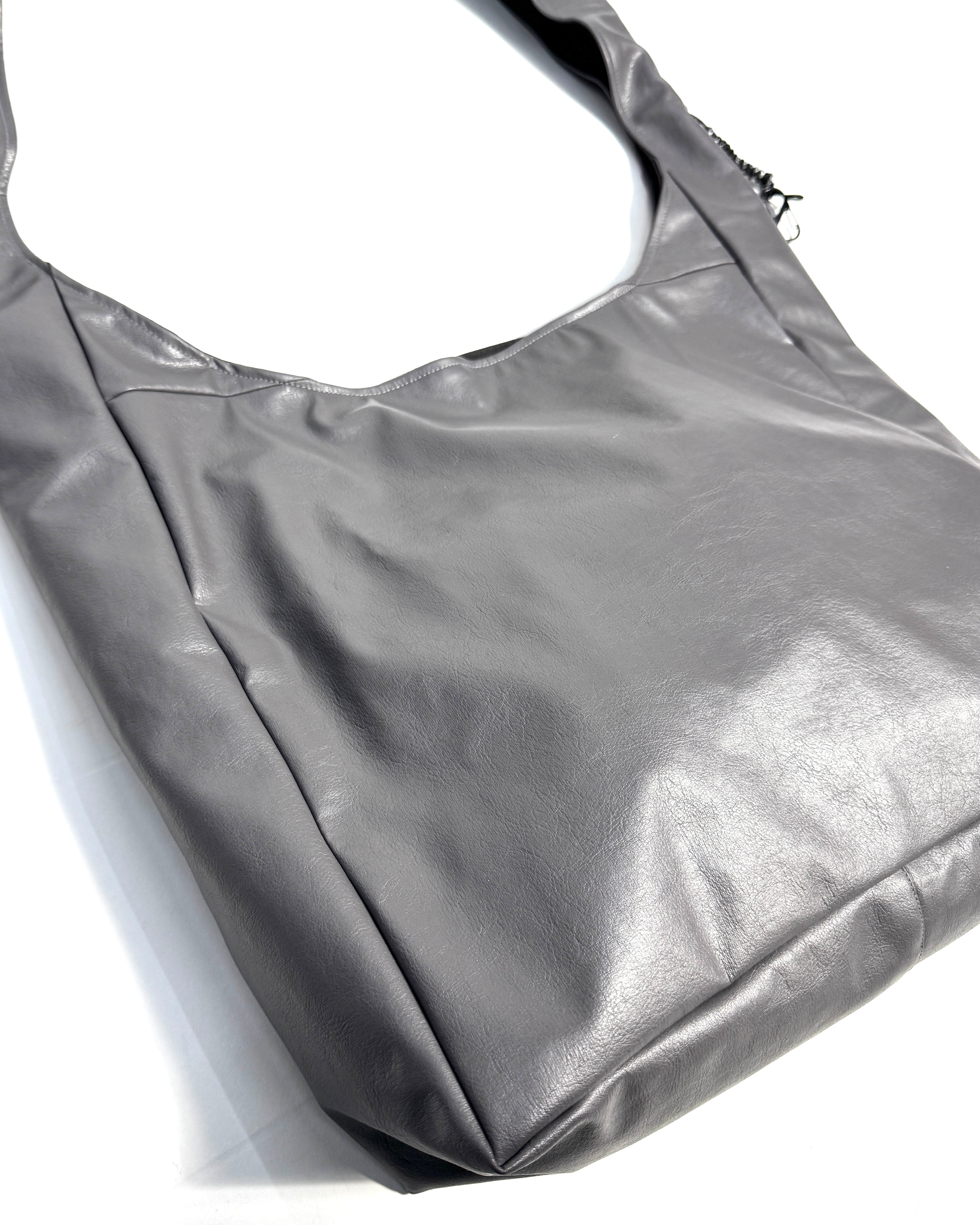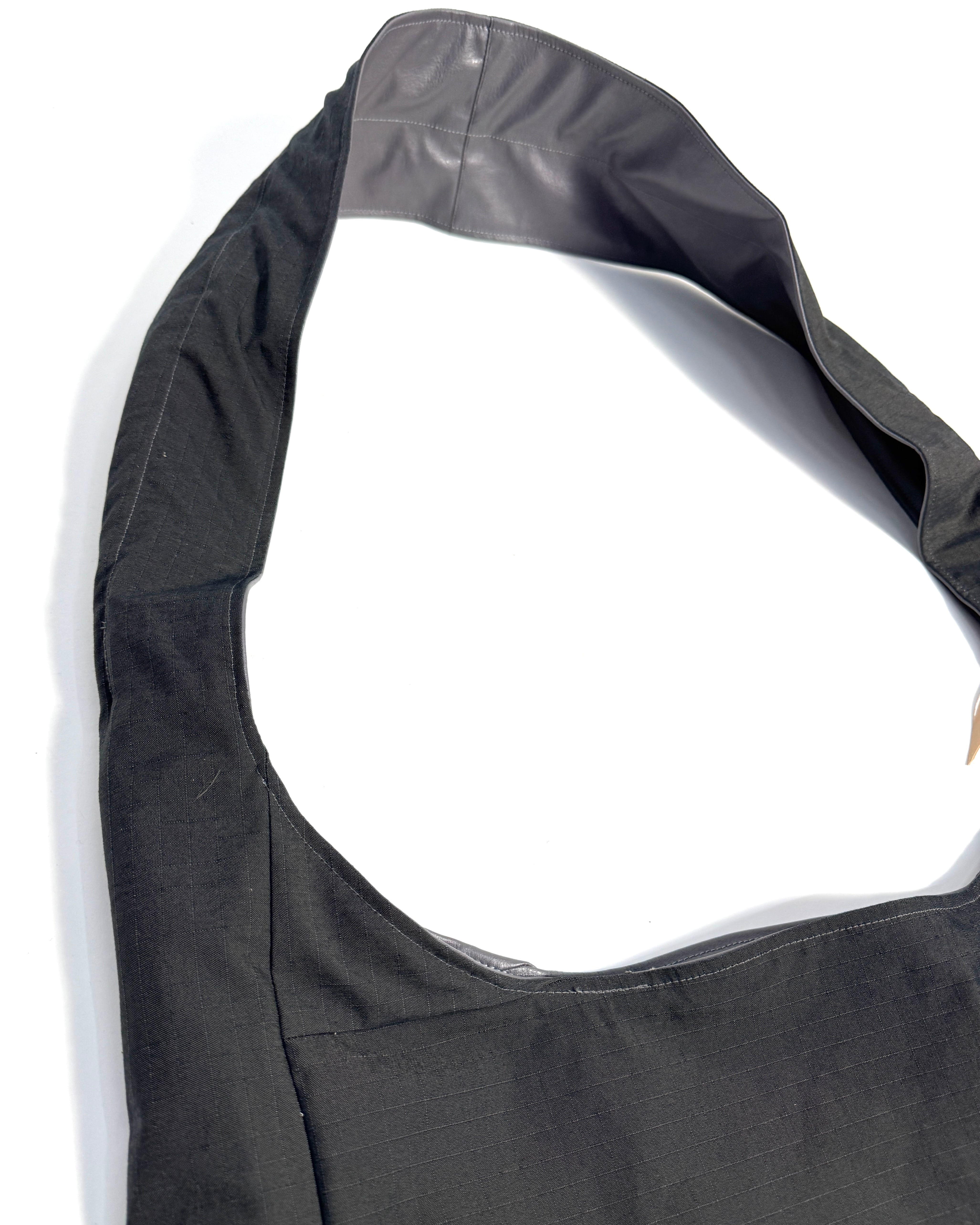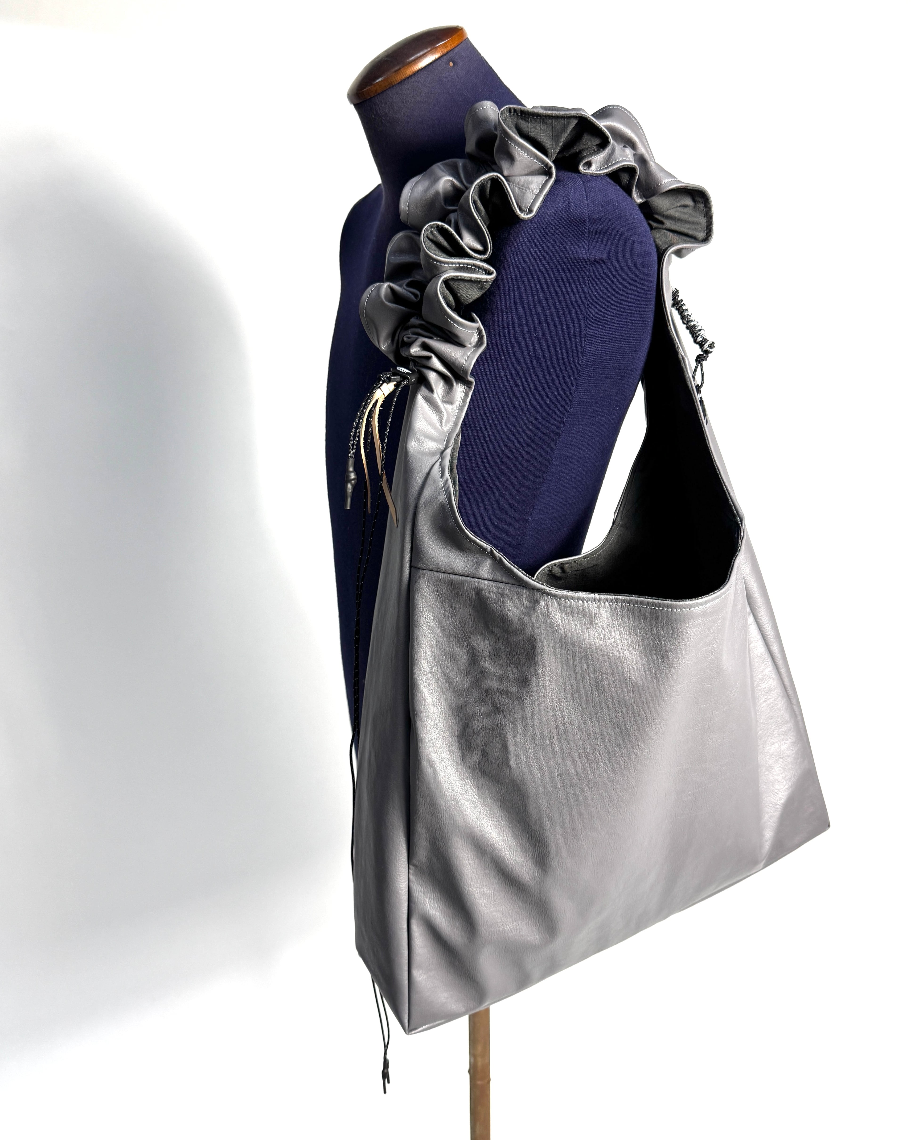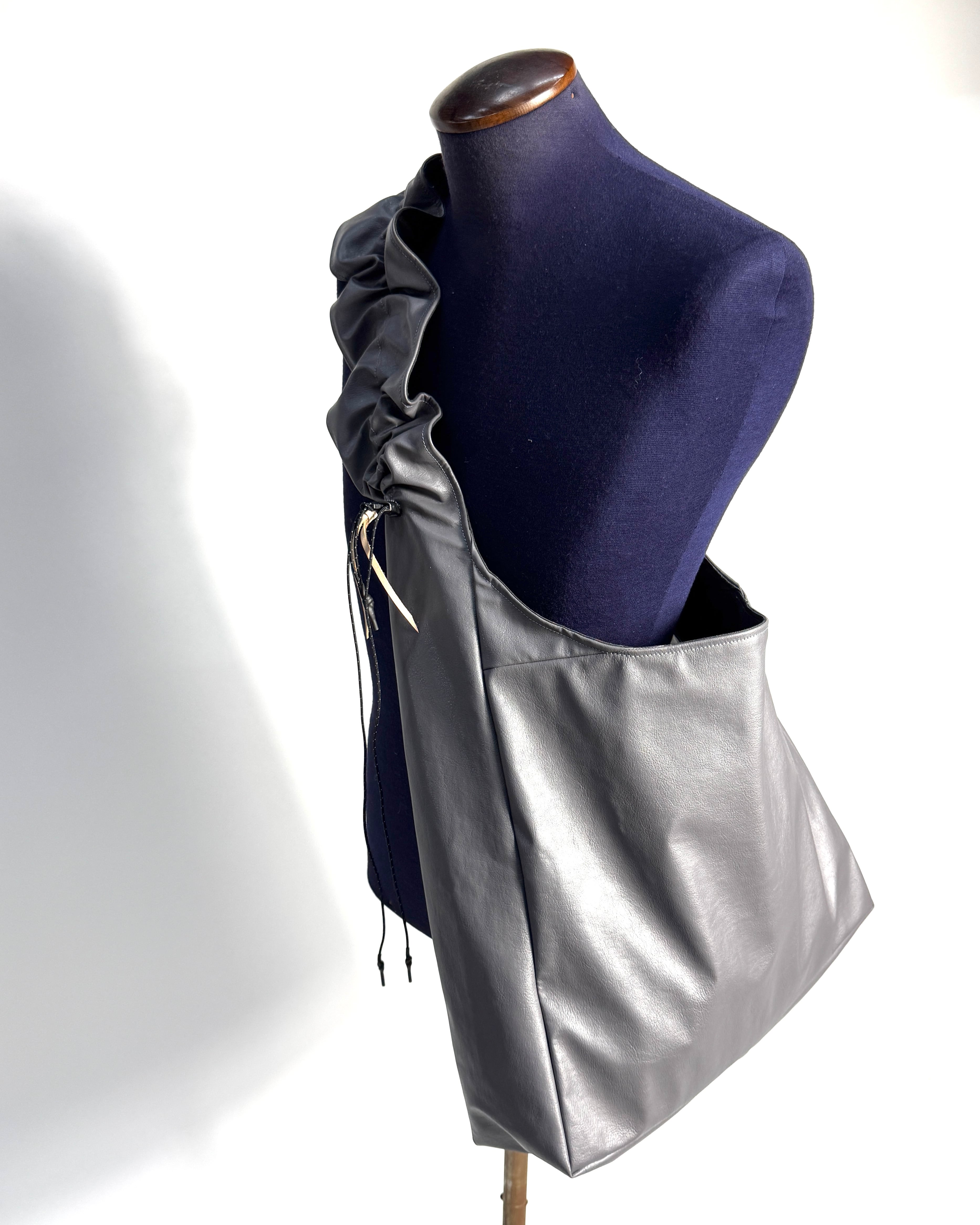 デッドストックファブリックを使用した大容量のショルダーバッグ。